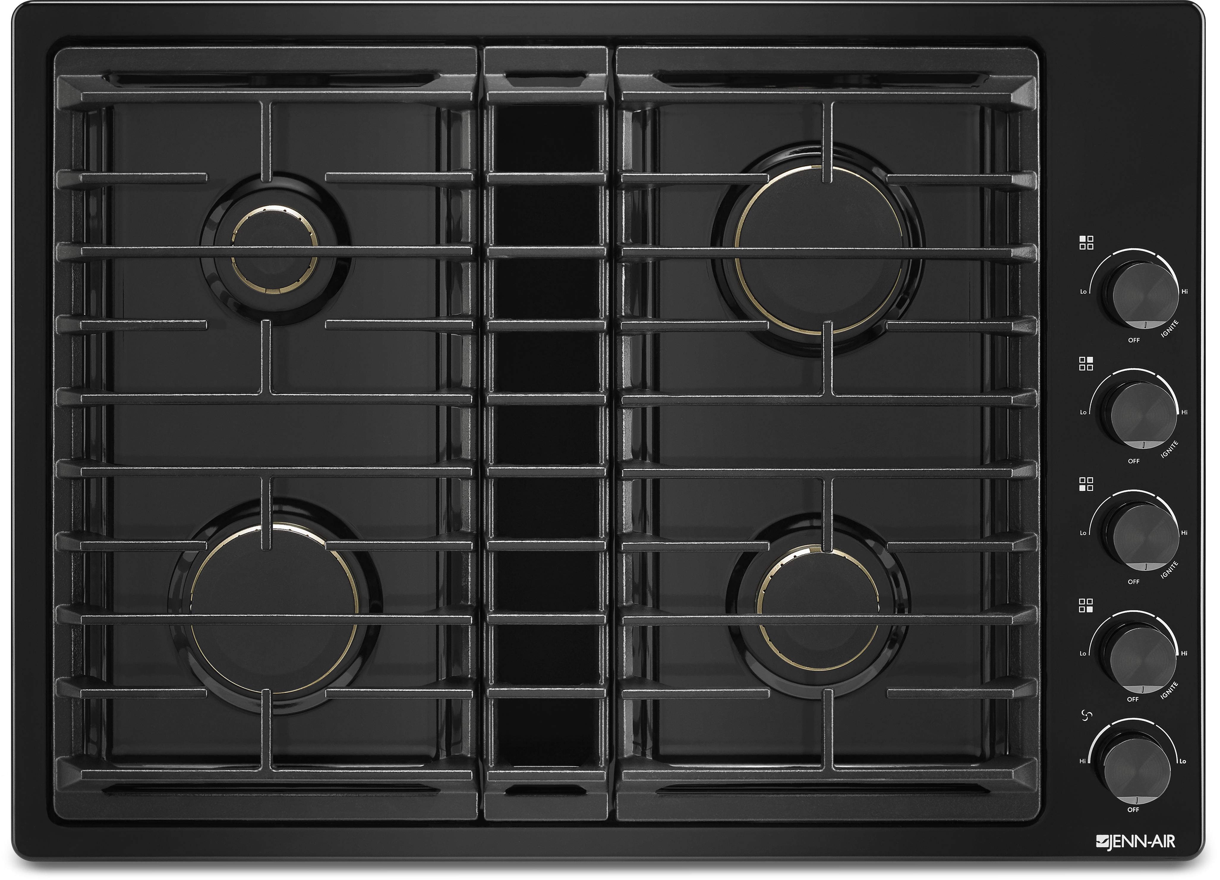 This Jenn-Air® luxury gas downdraft cooktop features four sealed burners, including a 17,000 BTU ultra-high output burner. Its impressive JX3™ downdraft ventilation system quickly and efficiently clears the air without a hood.