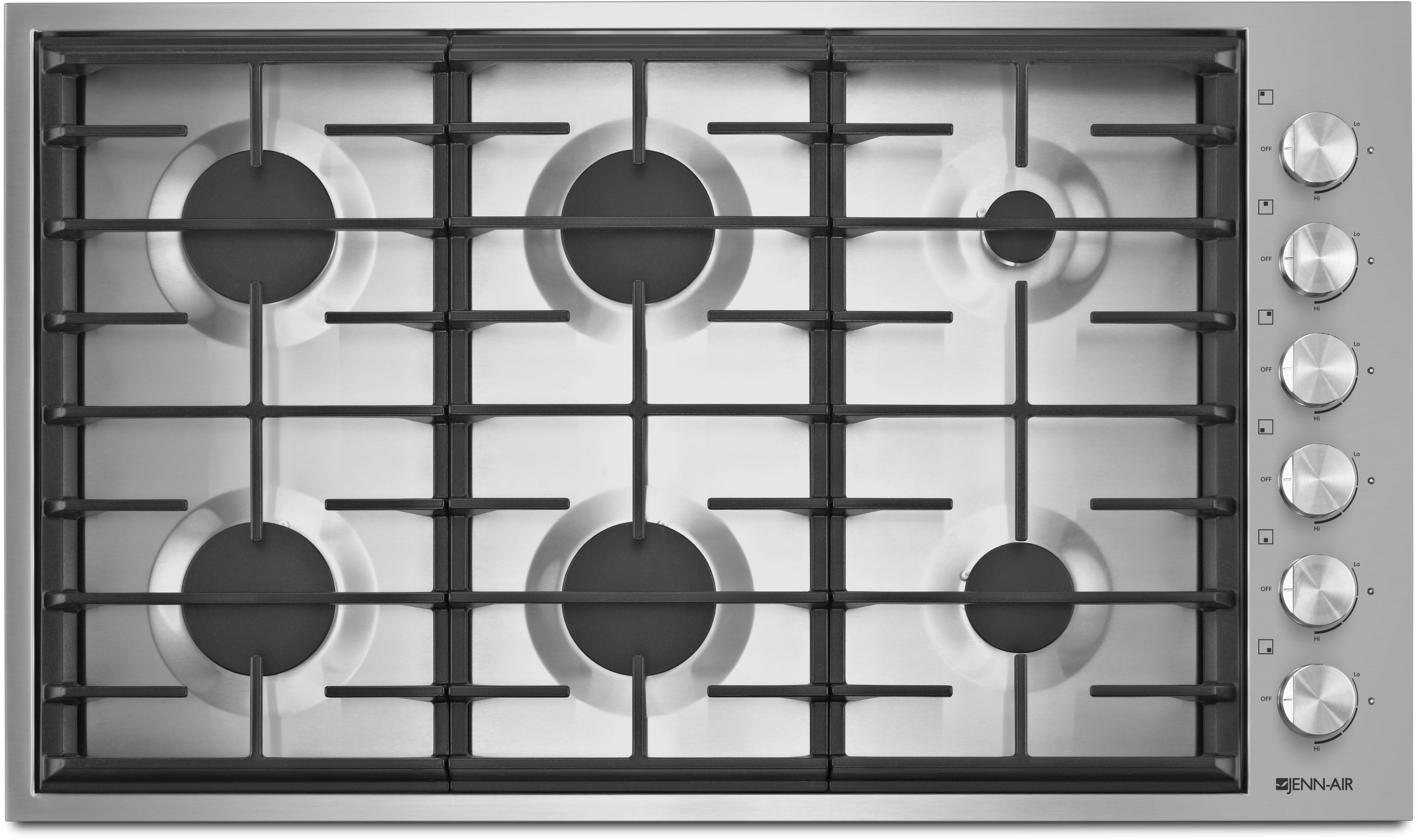 With a combined 78,000 BTUs of power, this luxury Jenn-Air® gas cooktop is an exceptionally robust six-burner, 36-inch cooktop. Its Simmer/Melt Burner reaches as low as 800 BTU, while an extremely low profile allows for near-flush countertop installation.Read More