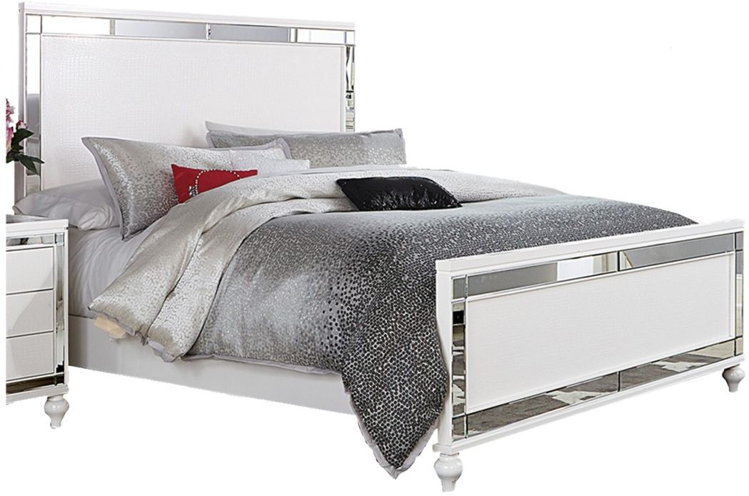 Adding a bold touch of glamour to your boudoir is the Alonza Collection. Finished in a brilliant white, the embossed alligator board is reflected in the inlay mirrors of the Eastern King bed. Turned feet provide a distinct departure from the linear design, adding a distinctly feminine flair.Read More