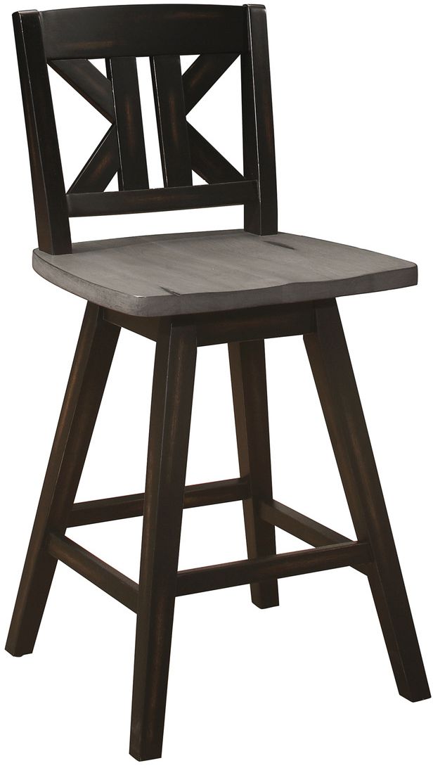 Creating a subtle rustic look for your dining space is the Amsonia Collection. A black sand-through finish graces the solid rubberwood 24-inch divided X-back swivel counter height chair, highlighting the veneer.Read More