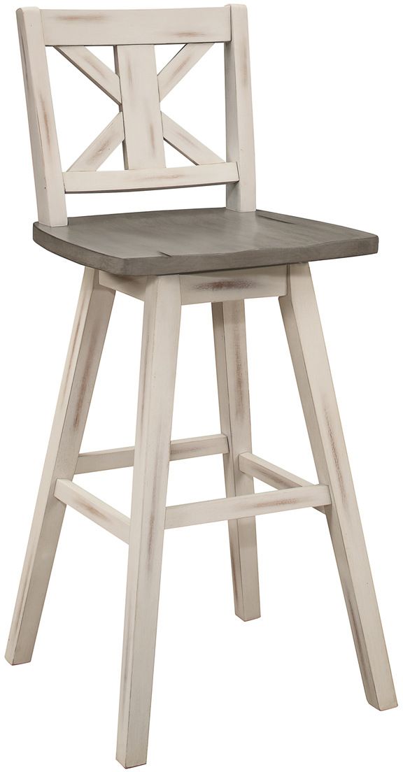 Creating a subtle rustic look for your dining space is the Amsonia Collection. A white sand-through finish graces the solid rubberwood 29-inch swivel X-back counter height chair, highlighting the veneer.Read More