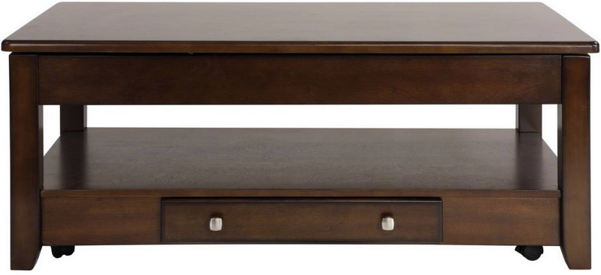Designed for placement in a number of living room settings, the Ballwin Collection is a functional and stylish addition to your home. The cocktail’s tabletop lifts to extend to your seated position and is supported by casters for ease of movement. Functional drawers are featured on the cocktail and end table. Providing additional tabletop space is the accompanying chairside table. A deep cherry finish over book matched veneers solidifies this versatile occasional grouping.Read More