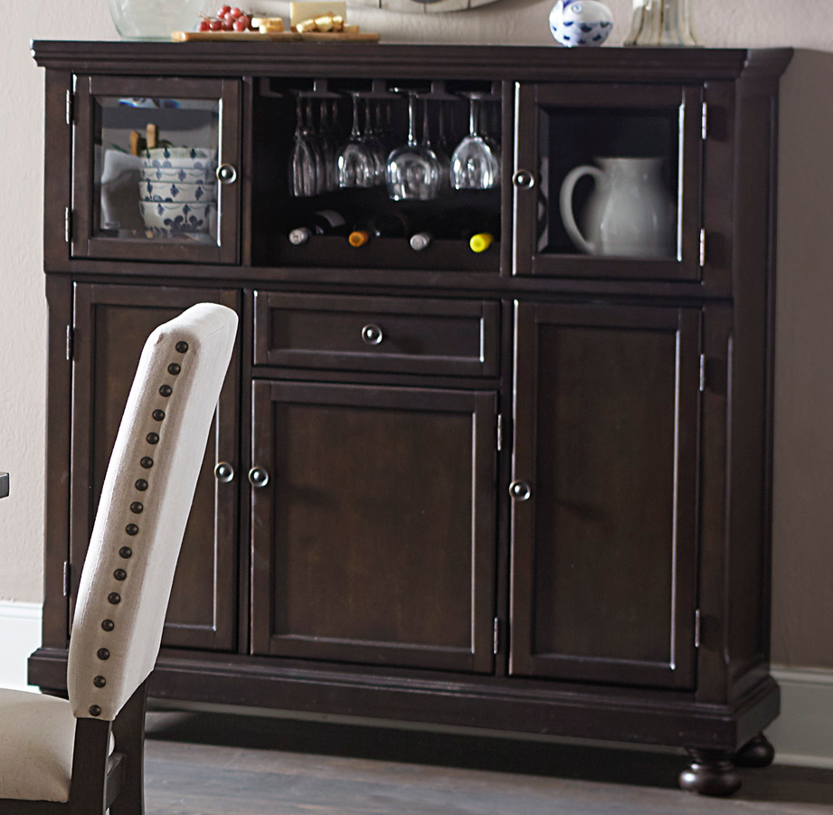 The gray finish and traditional styling of the table, chairs and server lends distinctly to the execution of different looks from traditional to country casual. Knob hardware punctuates the look of each framed drawer and door front on accompanying server. Behind glass door display storage and wine glass rack provide additional functionality neutral toned fabric chairs perch atop turned legs and feature nail head accent that serves to define the chair back’s profile.