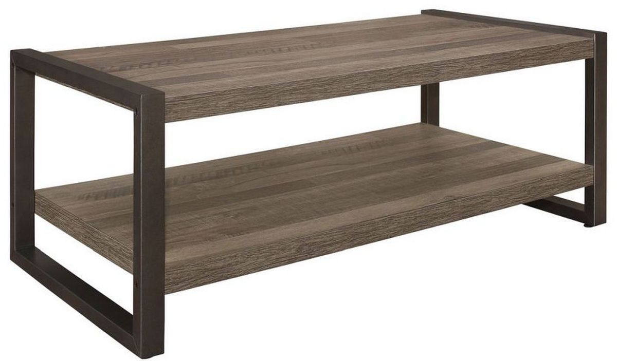 With a large lower shelf, the gunmetal finish of the metal frame provides distinct contrast to the printed brown wood grain melamine veneer of the modernly styled Douge Collection cocktail table.Read More