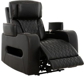 The Colton Power Glider Recliner brings sleek comfort and smart function to your solo lounging setup. Finished in quilted leather match with bold tufted details, it combines high-contrast style with full-body support. Power recline and an adjustable headrest let you fine-tune your position for movie night, gaming, or quick naps. Each armrest includes a built-in cupholder and hidden compartment for remotes or chargers, while deep side storage keeps extras neatly tucked away. A control panel inside the seat puts USB and Type-C ports within reach, so you can power up without pausing the action.Read More